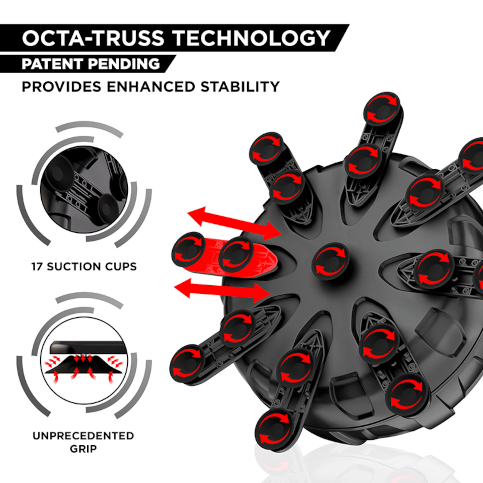 - Die patentierte Octa-Truss-Basis mit 17 Saugnäpfen sorgt für maximale Bodenhaftung