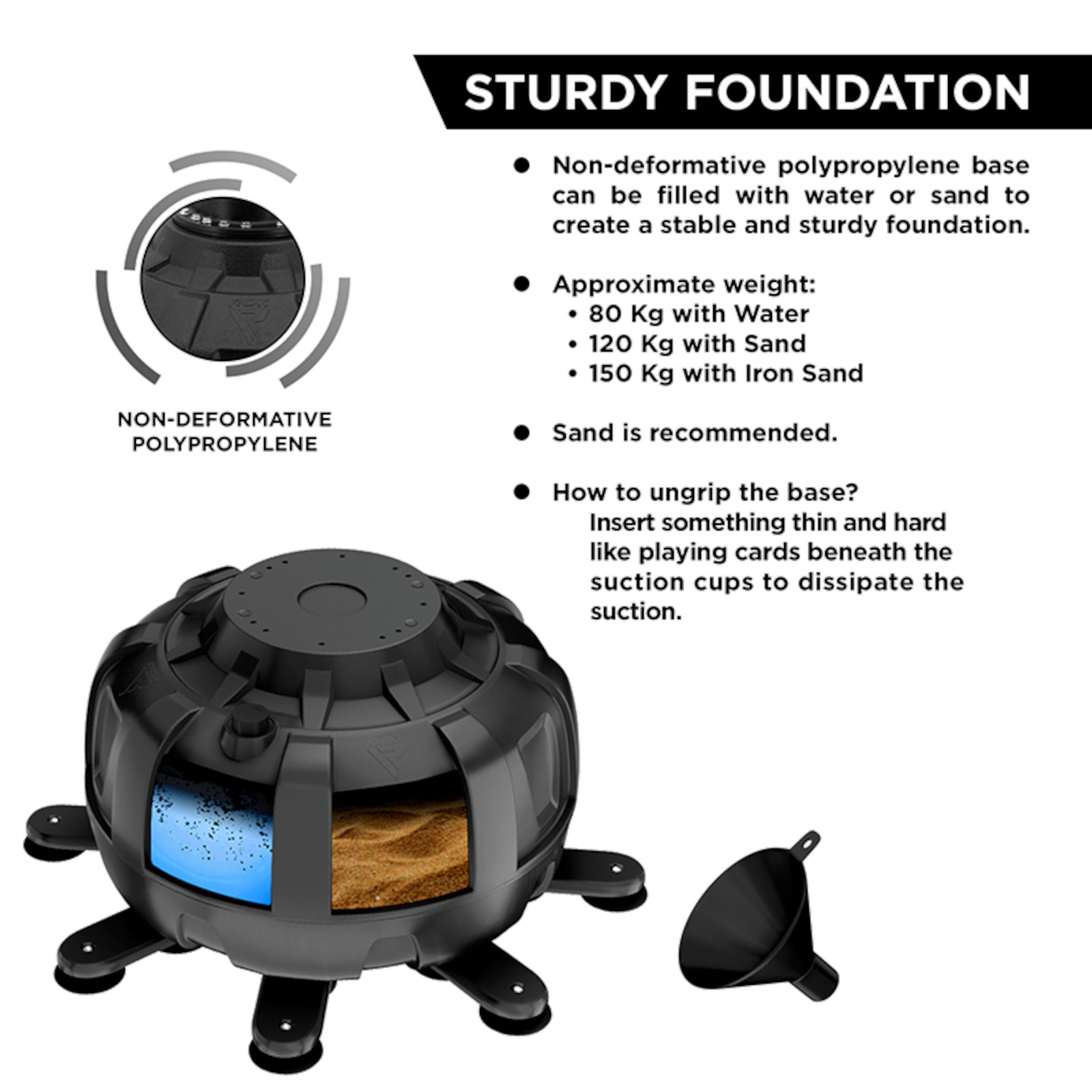 - Die Basis lässt sich mit bis zu 130 kg Sand oder 80 Liter Wasser befüllen